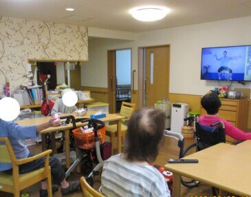 体操では映像や職員に合わせて手や足を動かしたりしました。